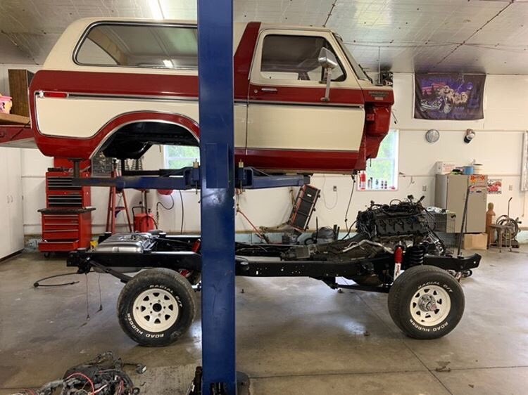 Steven Matko (Owner) says: After we did my Maroon Freewheeler Bronco my dad decided he needed one. I found his red and white one on Facebook Marketplace where it was in a Barn in Somerset PA since 1995. It was already without a engine so that was a great candidate for a coyote swap... We found another 2011 F-150 and harvested it’s vitals and reinstalled them on the 79 frame. We took more time on this one and painted all the frame and Inner Fenders. Bronco turned out great and gets 18 mpg on the Highway.